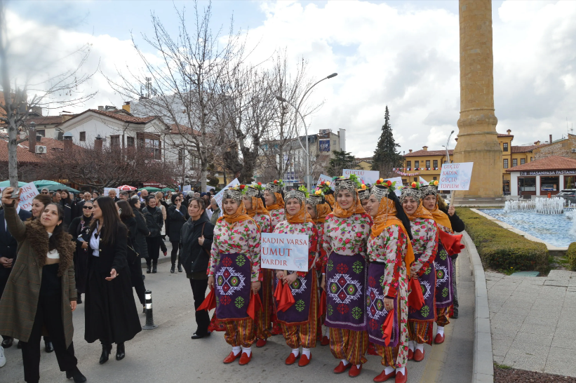Saat Kulesi önünde toplanan kadınlar, Bedesten’e kadar yürüyerek festival coşkusunu şehir merkezine taşıdı.