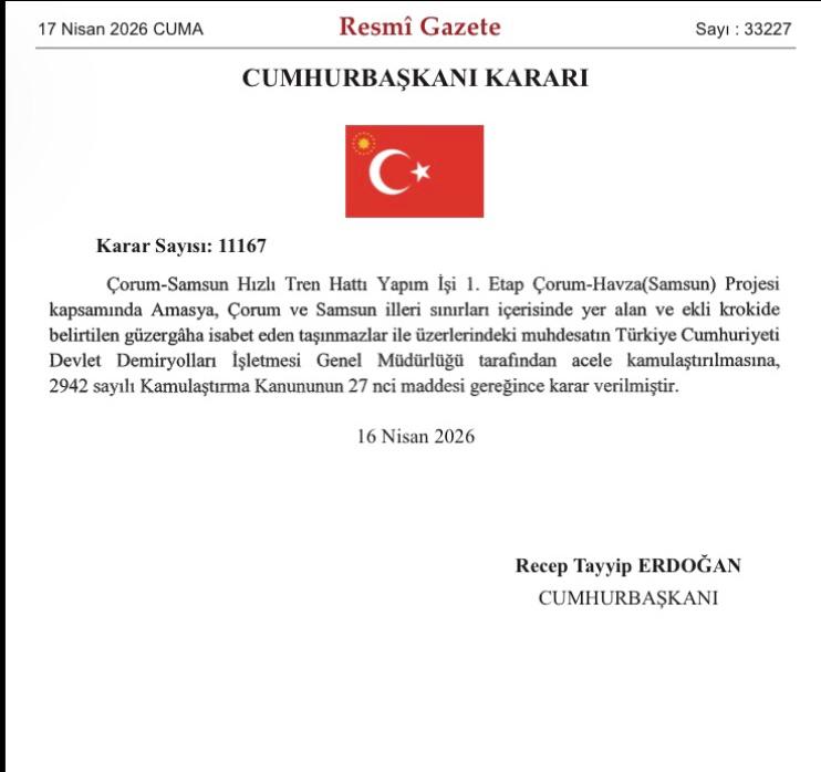 ÇORUM (Hitit TV Net) – Resmî Gazete’de yayımlanan Cumhurbaşkanı Kararı ile Çorum–Samsun Hızlı Tren Hattı’nın 1. etabı resmiyet kazandı. Proje kapsamında kritik “Acele Kamulaştırma” kararı alınırken, hattın yapım sürecinde önemli bir eşik daha geçildi.