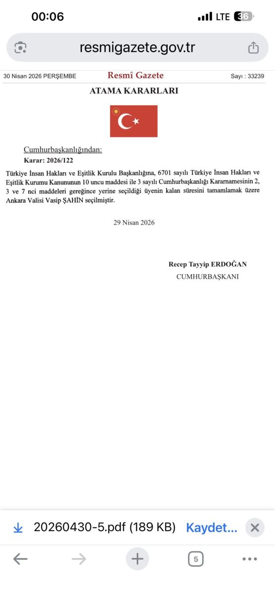Cumhurbaşkanı Recep Tayyip Erdoğan imzasıyla yayımlanan kararlara göre, Ankara Valisi Vasip Şahin Türkiye İnsan Hakları ve Eşitlik Kurulu Başkanlığı üyeliğine seçildi.