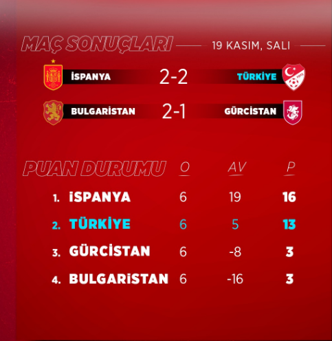 A Milli Futbol Takımımız, deplasmanda karşılaştığı İspanya ile 2-2 berabere kalarak grubunu ikinci sırada tamamladı ve 2026 Dünya Kupası play-off etabına yükselmeyi başardı.