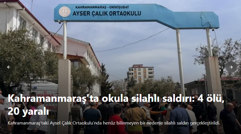 Kahramanmaraş’ta bir okulda meydana gelen silahlı saldırı, Türkiye’yi yasa boğdu. Ayser Çalık Ortaokulu’nda henüz bilinmeyen bir nedenle gerçekleştirilen saldırıda ilk belirlemelere göre 1’i öğretmen, 3’ü öğrenci olmak üzere 4 kişi hayatını kaybetti, 4’ü ağır 20 kişi yaralandı.