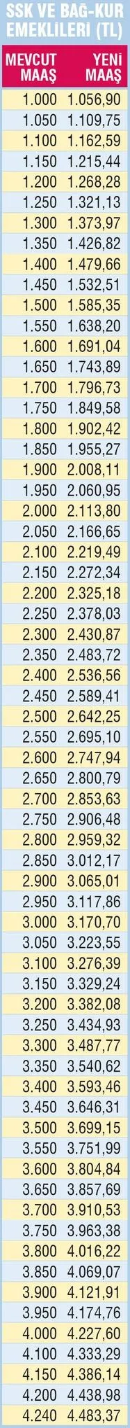 OCAK ayı zam oranının açıklanmasının ardından emeklilerin taban aylıkları da belli oldu. Maliye Bakanlığı'ndan yapılan açıklamaya göre; en düşük maaşlar memur emeklilerinde bin 871 liradan bin 978 liraya, SSK emeklilerinde bin 485 liradan bin 570 liraya, esnaf Bağ-Kur emeklilerinde bin 330 liradan bin 405 liraya yükseldi. Türkiye Emekliler Derneği (TÜED) Genel Başkanı Kazım Ergün de 2000'den önce emekli olan SSK'lıların taban aylıklarının ek ödeme dahil 935 lira 60 kuruşa çıktığını, en düşük maaşın Bağ-Kur tarım emeklilerinde ise 988 lira 91 kuruş olduğunu kaydetti.