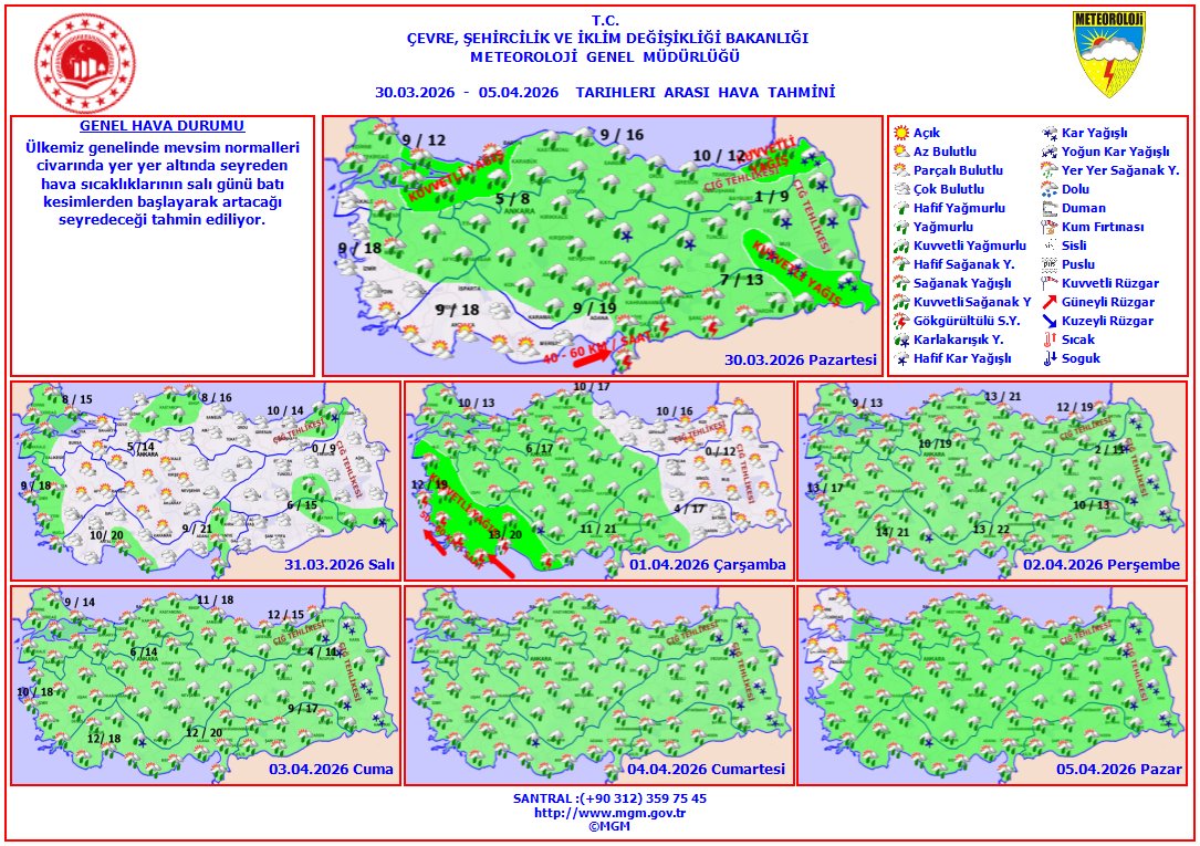 Hafta boyunca beklenen en yüksek sıcaklıkların Ankara’da 7-16, İstanbul’da 14-16, İzmir’de 16-19, Antalya’da 20-22 ve Erzurum’da 9-12 derece aralığında olması öngörülüyor.