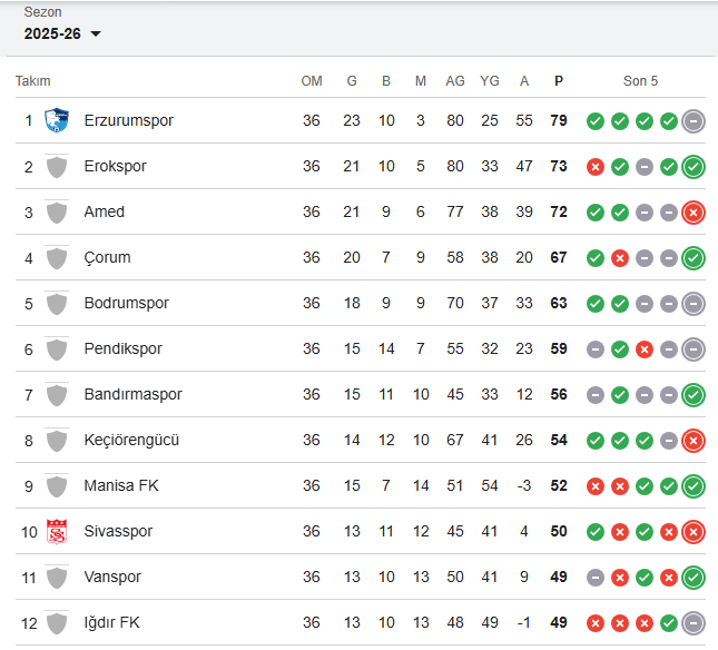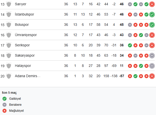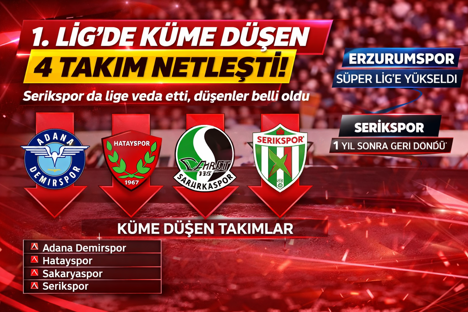 Daha önce Adana Demirspor, Hatayspor ve Sakaryaspor’un küme düşmesi kesinleşirken, 36. hafta maçlarının ardından Serikspor da lige veda eden son takım oldu.