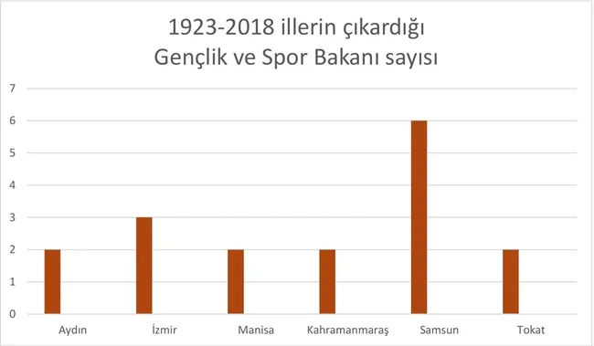 Gençlik ve Spor Bakanlığı'nda 6 kez bakanlıkla açık ara Samsun lider. Ama bu liderlik 2002'den sonra geliyor. 1923-2002 arasında Samsun'un hiç Gençlik Spor Bakanlığı yok. Lider de İzmir (3). Fakat 2002'den sonra Samsun atağa geçiyor ve 2018 itibariyle 6 kez bakanlık elde ederek lider oluyor.