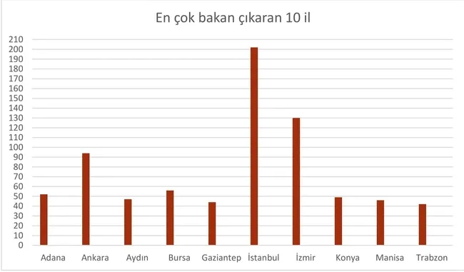 1923-1950 arasında en çok bakanlık elde eden il İzmir. 49 kere bakan çıkarmış. İzmir'i 28 kez bakan çıkaran İstanbul takip ediyor. Ankara ise 27 yılda sadece 4 bakan ile hükümetlerde temsil edilmiş. Öyle ki o yıllarda Adana, Çankırı, Diyarbakır, Manisa, Sivas gibi iller Ankara'dan daha fazla bakan çıkarmış iller.