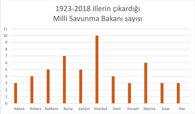Cumhuriyetin ilk yıllarında Milli Savunma Bakanlığı'na ağırlığını koyan iki il var. Manisa ve Balıkesir. Manisa 6 kez, Balıkesir 5 kez bakan çıkararak sıkı bir rekabet içindeler. Fakat 1980'e gelindiğinde farklı bir rekabet çıkıyor karşımıza. İstanbul sıkı bir atakla 8 kez bakan çıkaran il olarak liderliği elde ediyor. Bursa da 6 defa bakanlık elde edip İstanbul'un karşısına dikiliyor. 2018 itibarıyla İstanbul 10, Bursa 7 kez bakan çıkararak savunma bize emanet der gibiler.