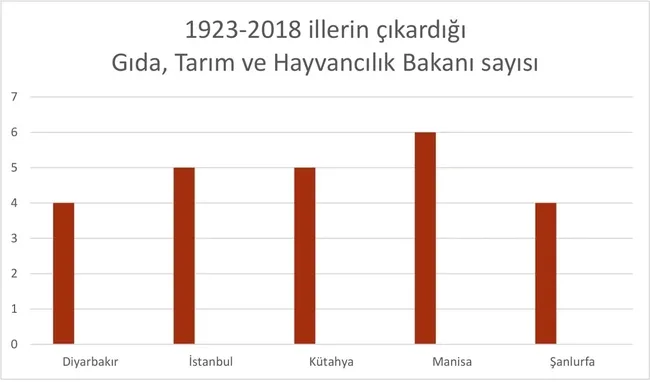 Gıda, Tarım ve Hayvancılık Bakanlığı'nın odağında tarım var. Tarım politikalarının belirlenip uygulandığı bu bakanlıkta Manisa cumhuriyetin ilk yıllarında üstünlük kuruyor ve bunu 2018'e kadar sürdürüp bu bakanlıkta lider oluyor. 1923-1950 arasında 5 kez bakan çıkaran Manisa'nın rakibi, 1960'a gelindiğinde 4 kez hükümetlere tarım bakanı sokan Kütahya oluyor. 1980'de 5'er bakanlıkla durum eşitleniyor. 1980 sonrası İstanbul, 2002'den sonra da Diyarbakır rekabete katılıyor. Son duruma ise şöyle: Manisa 6, İstanbul 5, Kütahya ve Diyarbakır 4'e kez bakanlık çıkarmış durumdalar