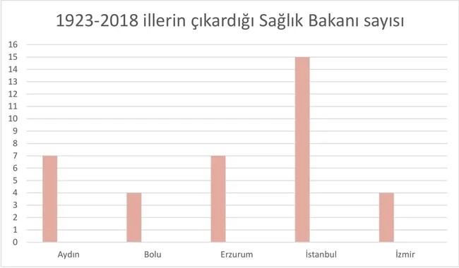 Sağlık Bakanlığı'nda 1950'ye kadar İstanbul ve Aydın söz sahibi. İki il de 7'şer kere bakan çıkararak başa baş giden bir rekabet içerisinde. Ama 1950'den sonra İstanbul lehine makas açılıyor. 2018 itibarıyla Sağlık Bakanlığı'nda 15 defa bakanlık çıkaran İstanbul'un ezici bir üstünlüğü var. Aydın cumhuriyetin ilk yıllarında Sağlık Bakanlığı'nda söz sahibi olsa da bunu sürdüremiyor. Son yılların gözdesi ise Erzurum oluyor. Erzurum özellikle 2002'den sonra atağa kalkıyor. 7 defa Sağlık Bakanı çıkararak Aydın ile ikinciliği paylaşıyor.