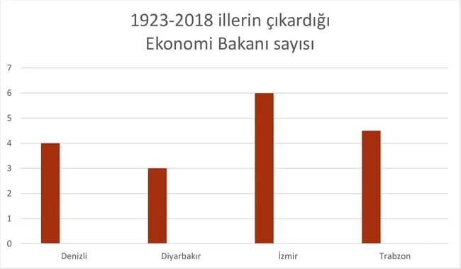 Ekonomi Bakanlığı'nda İzmir'in liderliği var. Ama rakipleri ne İstanbul ne Ankara. İzmir 6 defa Ekonomi Bakanlığı çıkarırken, güçlü rakipleri 4'er kez hükümetlerde temsil edilen Trabzon ve Balıkesir olmuş.
