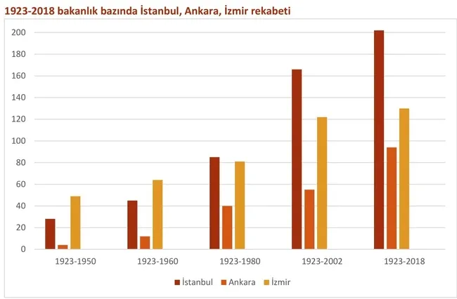 95 yıllık parlamenter sistemin en çok bakan çıkaran iki ili İstanbul (202) ve İzmir (130) arasında bazı bakanlıklarda hakikaten esaslı bir rekabet söz konusu. Örneğin Dışişleri Bakanlığı… 1923-1950 arasında İzmir'in (9) İstanbul (2) karşısında bir ağırlığı var. 1950'den sonra ise İstanbul aradaki makası kapatıyor. 1980'e gelindiğinde İzmir 9 kez, İstanbul ise 7 defa bakan çıkarmış durumda. Fakat buna rağmen İzmir liderliği bırakmıyor. 2018 itibarıyla durum şöyle: İzmir 11, İstanbul 10 defa bakan çıkardı.