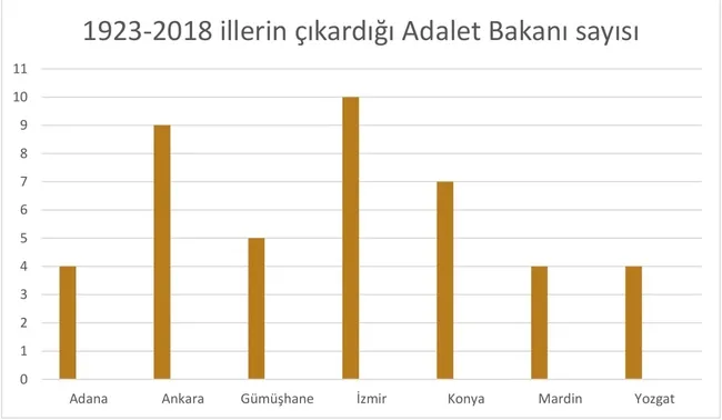 İzmir, 1923-1950 arasında 9 kere Adalet Bakanı çıkararak cumhuriyetin ilk yıllarından itibaren bu bakanlığa adeta damgasını vuruyor ve liderliği ele geçiriyor. Birinciliğini de 2018'e kadar sürdürüyor. İzmir, 1950'den 1980'e kadar hiç Adalet Bakanı çıkaramazken, Ankara 5, Konya 4 defa bakan çıkararak İzmir'e ciddi rakip oluyor. 2002'ye gelindiğinde İzmir 10, Ankara ve Konya 7, Gümüşhane 5 kez bakan çıkarıyor. 2018'deyse İzmir 10 kez Adalet Bakanı çıkartan il olarak liderliğini koruyor. Ankara ise 9 kez bakan çıkaran il olarak ikinci durumda.