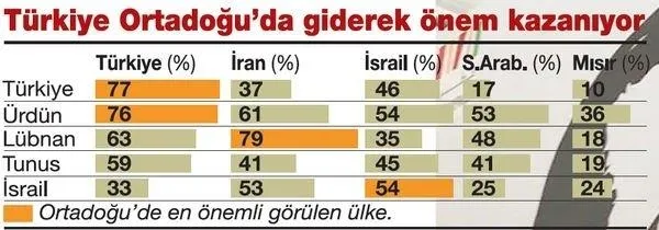 Habertürk'ün haberine göre; Farklı görüşte katılımcılardan sadece İsrailliler, Türkiye'nin bölgede oynadığı rolün azaldığına inandığını söyledi. Bu görüşün yüzde 45 özellikle İsrailli Yahudiler arasında yüksek olduğu belirlendi. Türkiye'nin bölgedeki etkinliğinin azaldığını düşünen İsrailli Arapların oranıysa yüzde 29. Lübnan'da tüm gruplar İran'ın bölgede oynadığı rolün arttığına inanıyor.