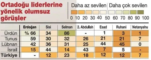 Araştırma kapsamında İsrail, Ürdün, Tunus, Lübnan ve Türkiye'den katılanlara Cumhurbaşkanı Recep Tayyip Erdoğan, İran Cumhurbaşkanı Hasan Ruhani, Suriye Devlet Başkanı Beşar Esad, Suudi Arabistan Kralı Selman, Ürdün Kralı Abdullah, İsrail Başbakanı Binyamin Netanyahu'ya nasıl baktıkları da soruldu.Cumhurbaşkanı Erdoğan, araştırma kapsamında ele alınan liderler arasında en popüler isim oldu. Erdoğan'ın popülaritesi Ürdün'de yüzde 66, Tunus'ta 59, Lübnan'da 42, İsrail'deyse 15 olarak belirlendi. Ortadoğu ve Kuzey Afrika'nın en az sevilen liderleriyse Netanyahu, Esad ve Ruhani oldular. Araştırmada diğer liderlerin pek çok ülkede Erdoğan'ın popülaritesinin hayli gerisinde kaldığı belirlendi.