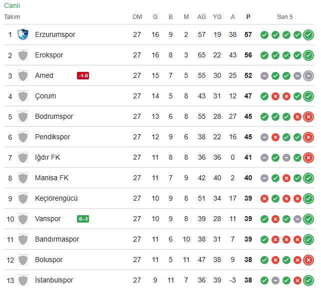 Alt sıralardan uzaklaşma mücadelesi veren Ümraniyespor ise son haftalardaki çıkışıyla dikkat çekiyor. Serik ve Hatayspor galibiyetlerinin ardından Erokspor’a kaybeden İstanbul temsilcisi, İstanbulspor ve Iğdır FK beraberlikleri sonrası geçen hafta Boluspor’u 4-2 mağlup ederek moral buldu.