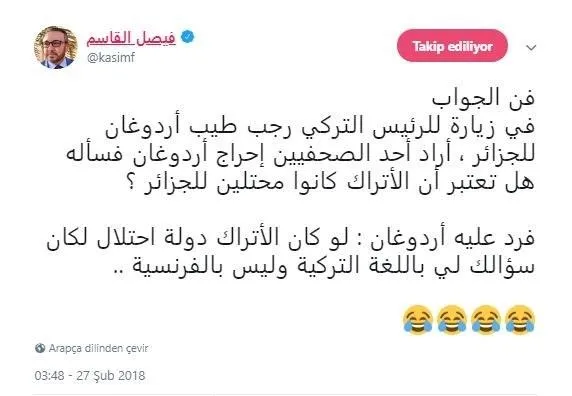Katarlı usta gazeteci Faysal Kasım, Erdoğan ile Cezayirli gazeteci arasında geçen o diyaloğu resmi tweetter hesabından paylaştı.