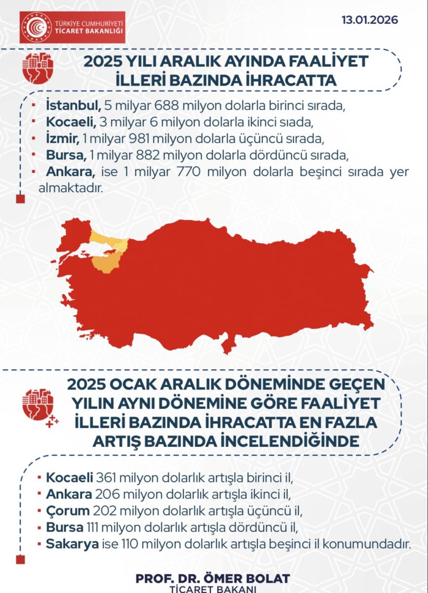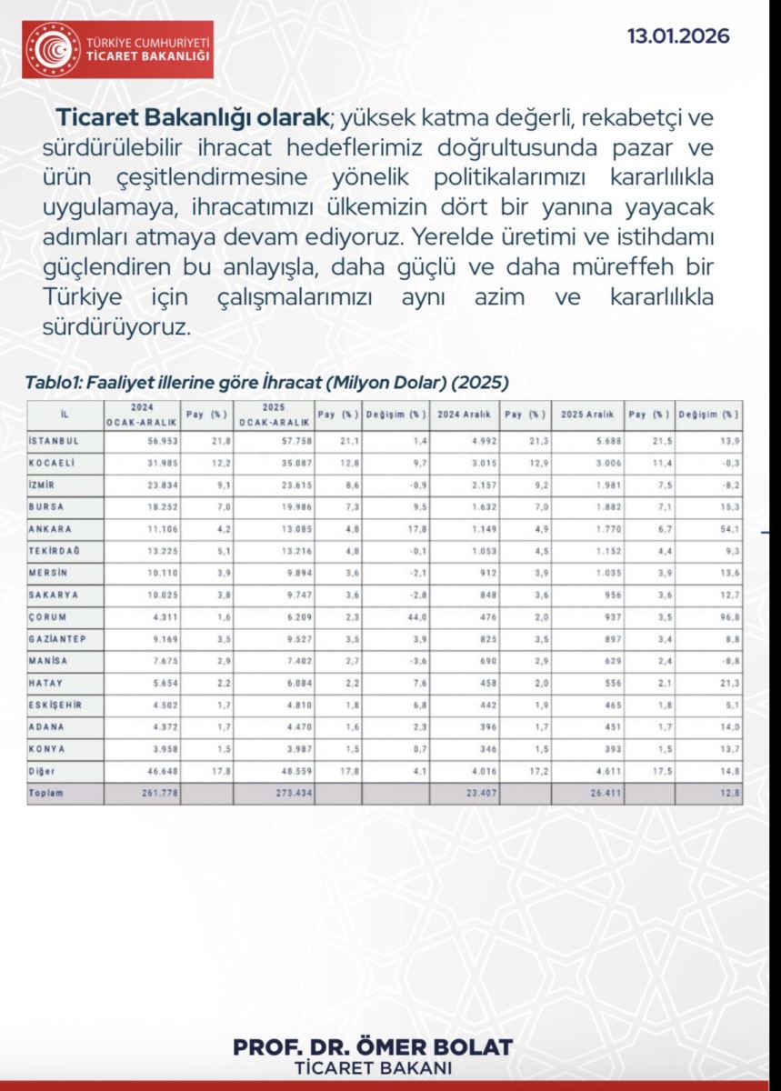 2025 yılı ihracat verilerinde Türkiye genelinde de güçlü artışlar yaşanırken, Çorum’un performansı ülke ortalamasının üzerinde gerçekleşti. Aralık 2025 dış ticaret verilerine göre Türkiye ihracatı genel seviyede yaklaşık 26,4 milyar dolar ile aylık bazda rekor seviyeye yaklaştı.