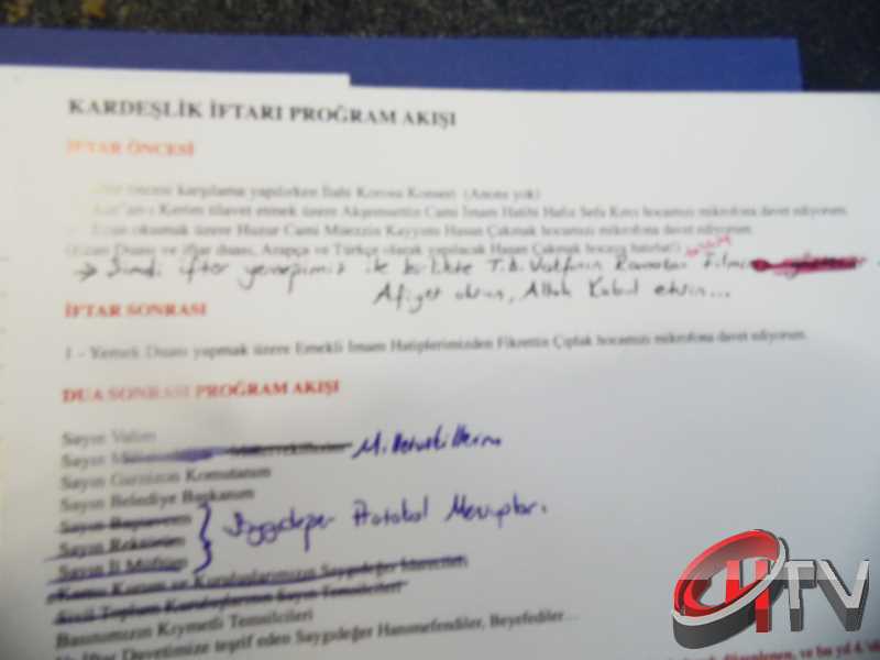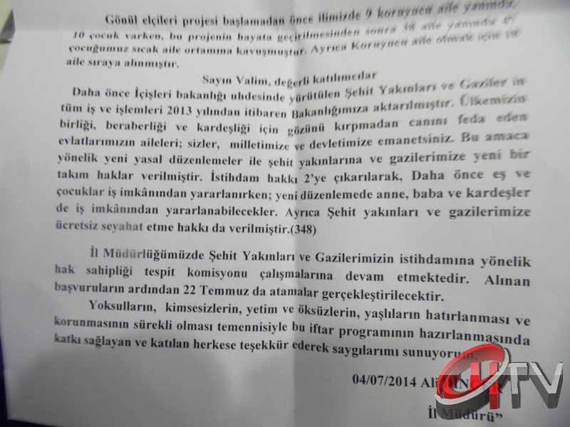Biz bürokratlar olarak birbirimize iftar vermiyoruz. Halkımızla olmaya çalışıyoruz. Sizlerle beraber olmaya çalışıyoruz. Hemen her masada bir bürokrat arkadaşımız sizlerle beraber oturuyor. Dolayısı ile burada halk, hepimiz iç içe, gönül gönüle, muhabbet içerisinde bir oruç açtık, iftar yaptık. İşte Ramazan Ayının bereketi bu. Bu vesile ile inşallah önümüzdeki bayramda da birlikte olacağız. Hatta Bayramlaşmalarımızı bundan sonra, eski kültür sitesinin yanındaki iftar çadırında yapacağız. Bu çadır bayram çadırı olarak düzenlenecek, üzerinde bayram çadırı yazacak ve şehrin tam göbeğinde olacak. Bayram namazını kıldıktan sonra, sizleri Bayram Çadırına bekliyoruz.
