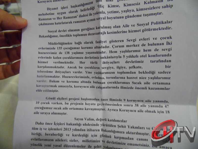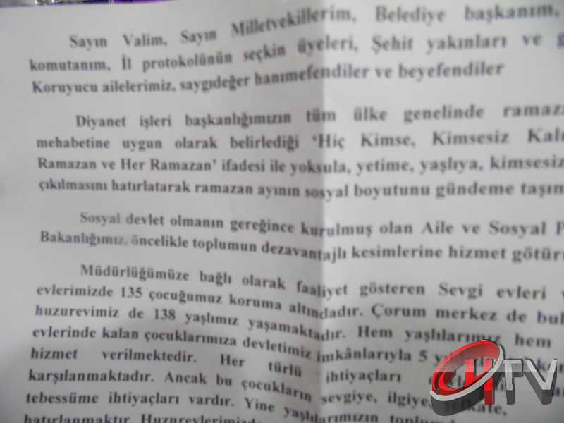 İftar yemeğinden sonra İl Müftüsü Mehmet Aşık kısa bir selamlama konuşması yaptı. İl merkezi ve ilçelerimizden buraya gelmek suretiyle bizleri onurlandıran ve şereflendiren kıymetli misafirlerimiz öncelikle hoş geldiniz diyerek sözlerine başlayan Vali Başköy, “Geçtiğimiz yıl sizlerle değişik ortamlarda birlikte olduk. Bu sene Çorum Müftülüğü ve Çorum Aile Ve Sosyal Politikalar İl Müdürlüğü müşterek organizasyonla ve valiliğimizin koordinesi ve nezaretinde, sizlere bu akşamki sofrayı hazırladık. Bizler sizlerle birlikte olmaktan memnuniyet duyuyoruz.