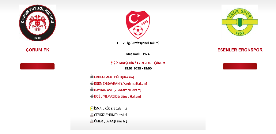 TFF 2. Lig Beyaz Grupta şampiyonluk mücadelesi veren Çorum FK, 29. hafta maçında sahasında ligin iddialı ekiplerinden Esenler Erokspor'u ağırladı. Haftasonu deplasmanda Amedspor'u mağlup ederek zirvedeki yerini koruyan temsilcimiz evinde hata yapmadı. Play-off potasında bulunan güçlü rakibini genç futbolcu Eren Aydın'ın 17. dakikada attığı golle 1-0 mağlup etmeyi başaran kırmızı siyahlılar, puanını 54'e çıkararak zirvedeki yerini korudu.
