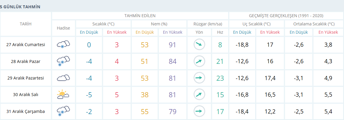 Pazartesi ve salı günü yağış öngörülmezken, 31 Aralık Çarşamba günü yeniden kar yağışının etkili olacağı tahmin ediliyor.