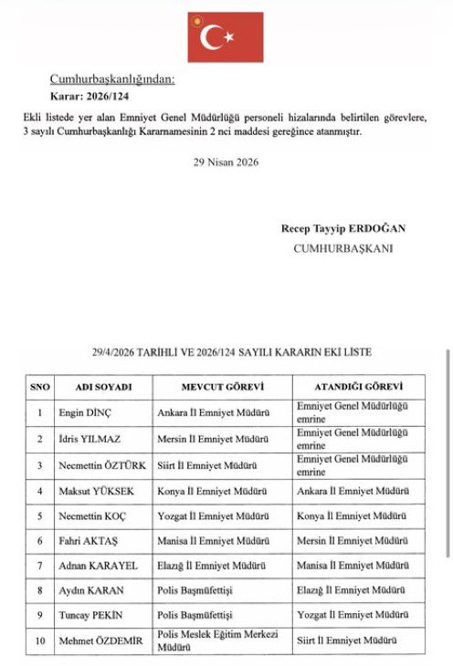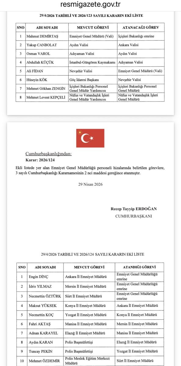 29 Nisan 2026 tarihli Resmi Gazete’de yayımlanan kararlarla emniyet ve mülki idare kadrolarında önemli görev değişiklikleri yapıldı. İşte öne çıkan isimler ve yeni görev yerleri...