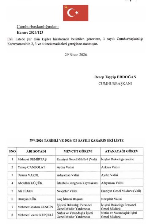 30 Nisan 2026 tarihli ve 33239 sayılı Resmi Gazete’de yayımlanan Cumhurbaşkanlığı Atama Kararları kapsamında vali ve emniyet teşkilatında önemli görev değişiklikleri gerçekleştirildi.