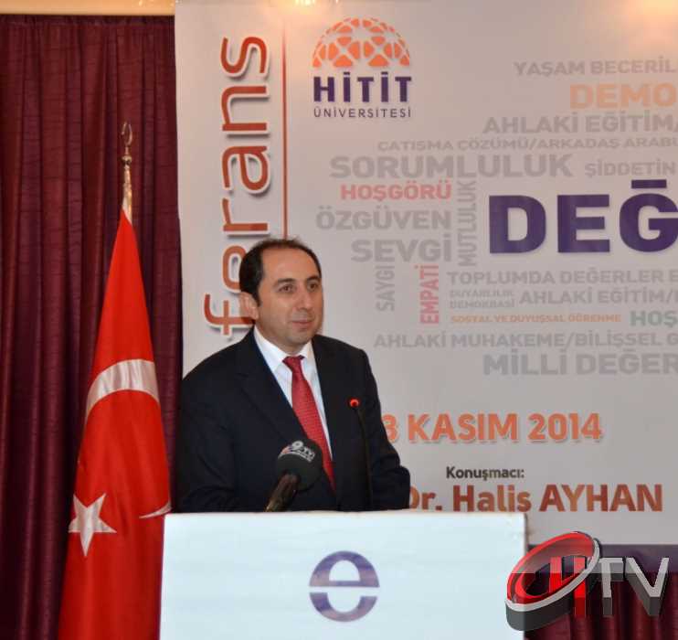 Hitit Üniversitesi ile Ensar Vakfı Çorum Şubesi işbirliğiyle yapılan “Toplumda Değerler Eğitimi” konulu konferans Turgut Özal Konferans Salonu’nda gerçekleştirildi.Prof. Dr. Halis Ayhan’ın konuşmacı olarak katıldığı etkinliğe; İstanbul Milletvekili Feyzullah Kıyıklık, Rektör Prof. Dr. Reha Metin Alkan, Üniversite öğretim üyeleri ile öğrencileri ve Çorum halkından yoğun katılım oldu