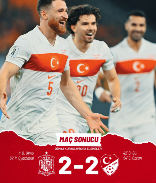 A Milli Futbol Takımımız, deplasmanda karşılaştığı İspanya ile 2-2 berabere kalarak grubunu ikinci sırada tamamladı ve 2026 Dünya Kupası play-off etabına yükselmeyi başardı.