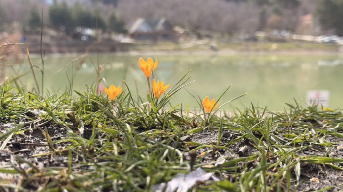 Halk arasında "baharın müjdecisi" olarak bilinen sarı çiğdem ile mor menekşeler göl çevresinde güzel görüntüler oluşturdu.