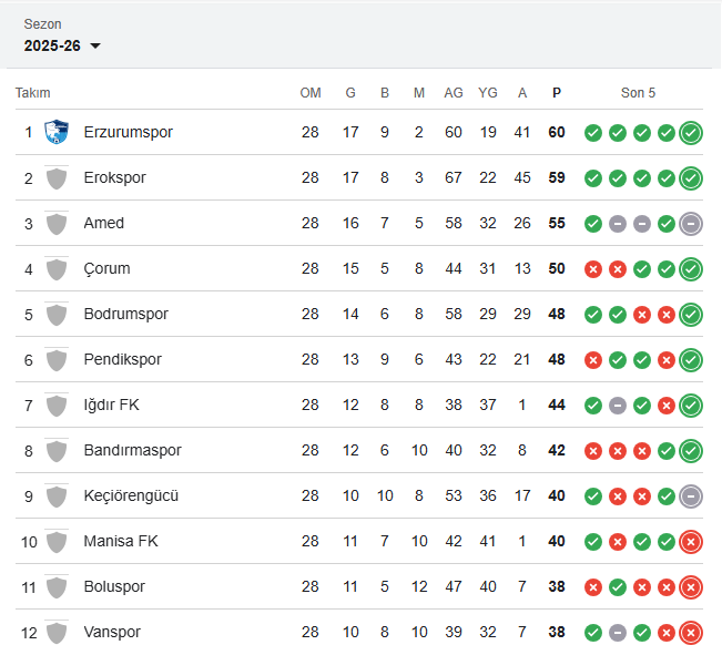 Zirve yarışında haftanın sonuçları Çorum FK adına ayrı bir önem taşıyor. Erzurumspor FK ve Esenler Erokspor haftayı galibiyetle kapatırken, Amed SK deplasmanda Keçiörengücü ile 2-2 berabere kaldı.