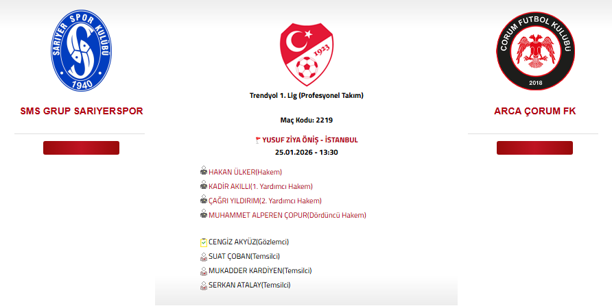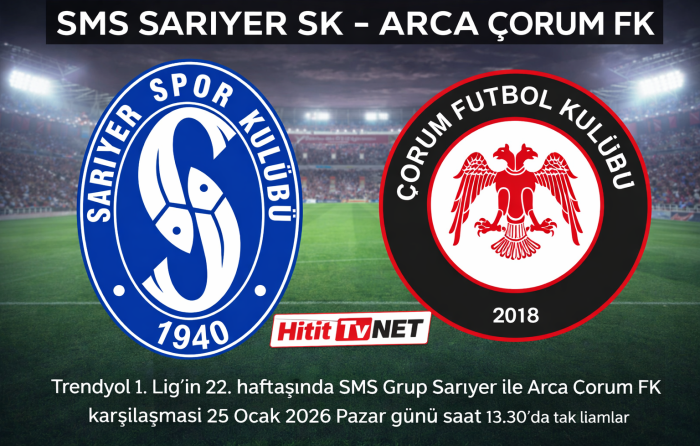 Trendyol 1. Lig’in 22. haftasında SMS Grup Sarıyer ile Arca Çorum FK karşılaşması 25 Ocak 2026 Pazar günü saat 13.30’da İstanbul’daki Yusuf Ziya Öniş Stadyumu’nda oynanacak. Bu kritik maç, her iki takım için de ligde üst sıralara tırmanma adına önemli bir fırsat olacak.