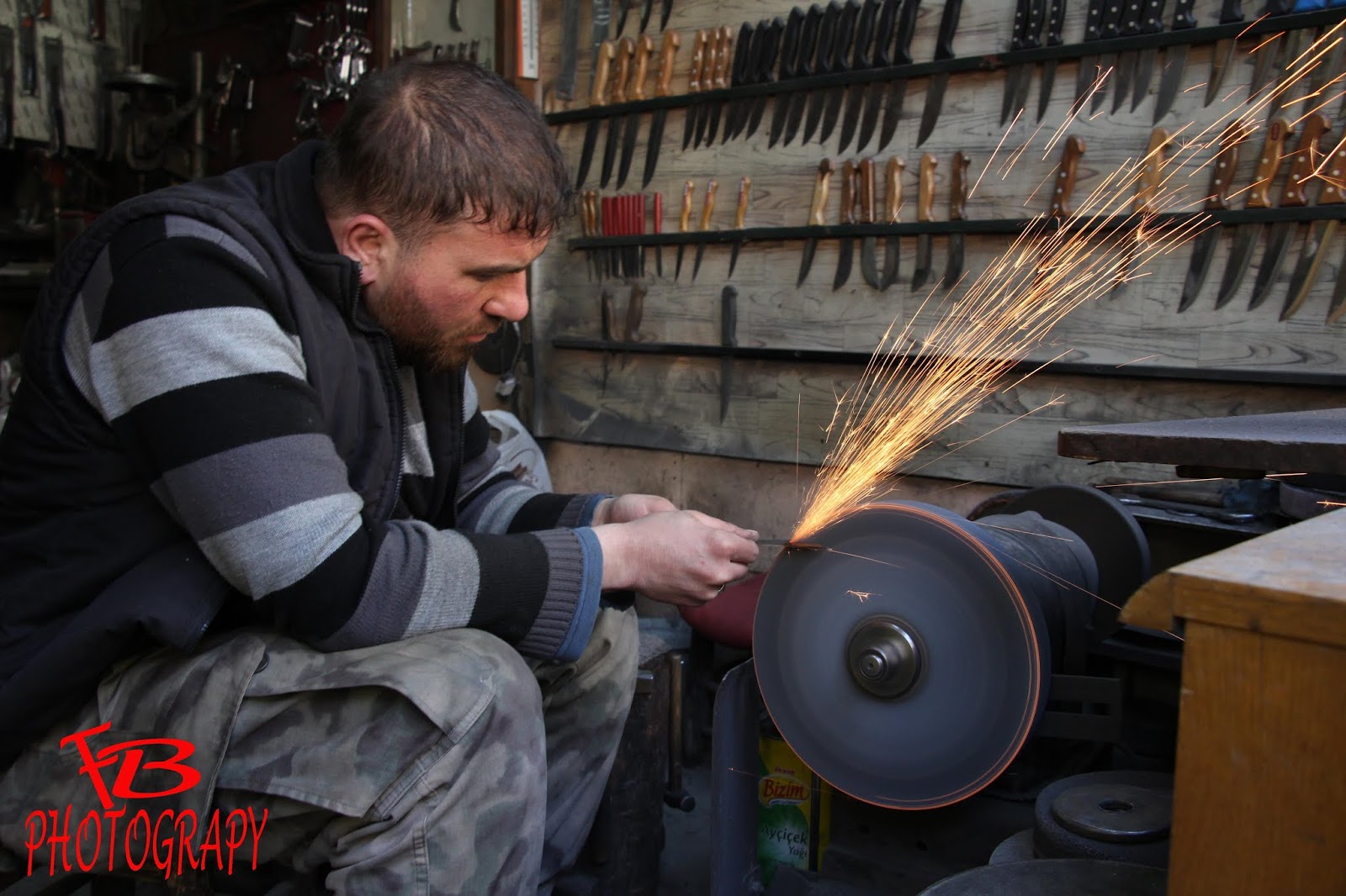 Dedim ya Ayakkabbıcılar Arastası içerisinde sadece ayakkabıcılar yok.Çay ocakları,Bileyiciler,Terziler ve daha birçok esnaf burada hayatını sürdürüyor.Bunlardan bıçak satıcı yapan bir dükkana konuk olmuştuk.Vakit Kurban bayramına yaklaştığı için bıçak bileme zamanı idi.Elinde bıçakla bu esnafı görünce bu kareyi kaçırmak istememiştik.Bileme yaparken çıkan kıvılcımlar bizim eşsiz kareler çekebilmemizi sağlamıştı.Fotoğraf çekiminin ardından teşekkür ederek başka esnaflara yönelmiştik.