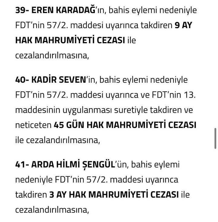 Arda Hilmi Şengül’ün, bahis eylemi nedeniyle FDT’nin 57/2. maddesi uyarınca takdiren 3 ay hak mahrumiyeti cezası ile cezalandırılmasına karar verilmiştir” denildi.
