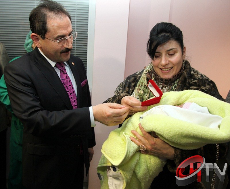 Yeni yıla Hitit Üniversitesi Çorum Eğitim ve Araştırma Hastanesi'nde giren Vali Başköy ve beraberindekiler, doğum servisini ziyaret ederek, Mahmut-Neşe Öztemiz çiftinin saat 00.05'te dünyaya gelen üçüncü bebeğine altın taktı.